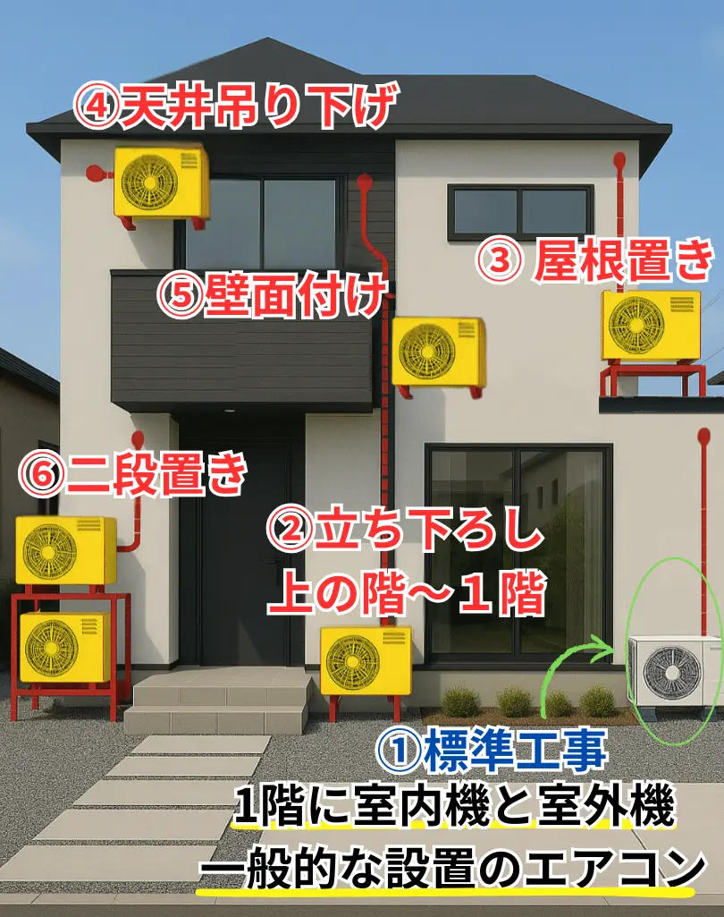 一般的な設置とは、1階に室外機があり、室内機も1階に設置してある標準工事になります。